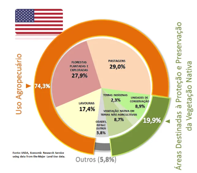 Quando comparamos o Brasil a outras potencias mundiais, como os Estados Unidos da América, fica nítido que estamos a frente quando o assunto é preservação ambiental. Dados de 2017 provam isso, a equipe da Embrapa Territorial com base nos dados do Economic Research Service do USDA, utlizando dados do Major Land Use , construiu um gráfico semelhante. Perceba que o uso das terras pro setor agropecuário americano é de em torno ⅔ do território e menos de 20% é destinado a proteção e preservação da vegetação nativa. Aqui fica claro que, quando falamos em SUSTENTABILIDADE E PRESERVAÇÃO o AGRO BRASILEIRO é referência.