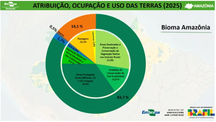 O estudo apresentado durante a COP 30 ainda mostrou a atribuição, ocupação e uso das terras no bioma Amazônia. Repare que apenas 14,1% desse bioma é ocupado pelo Agro. Sendo 12,1% para pastagens e apenas 2% para lavoura. Vale destacar que essa área de pastagens, muitas vezes, é oriunda de pessoas que não representam o agro, pois desmatam de forma ilegal. E, em alguns casos, são terras governamentais que não passam pela fiscalização que deveriam.