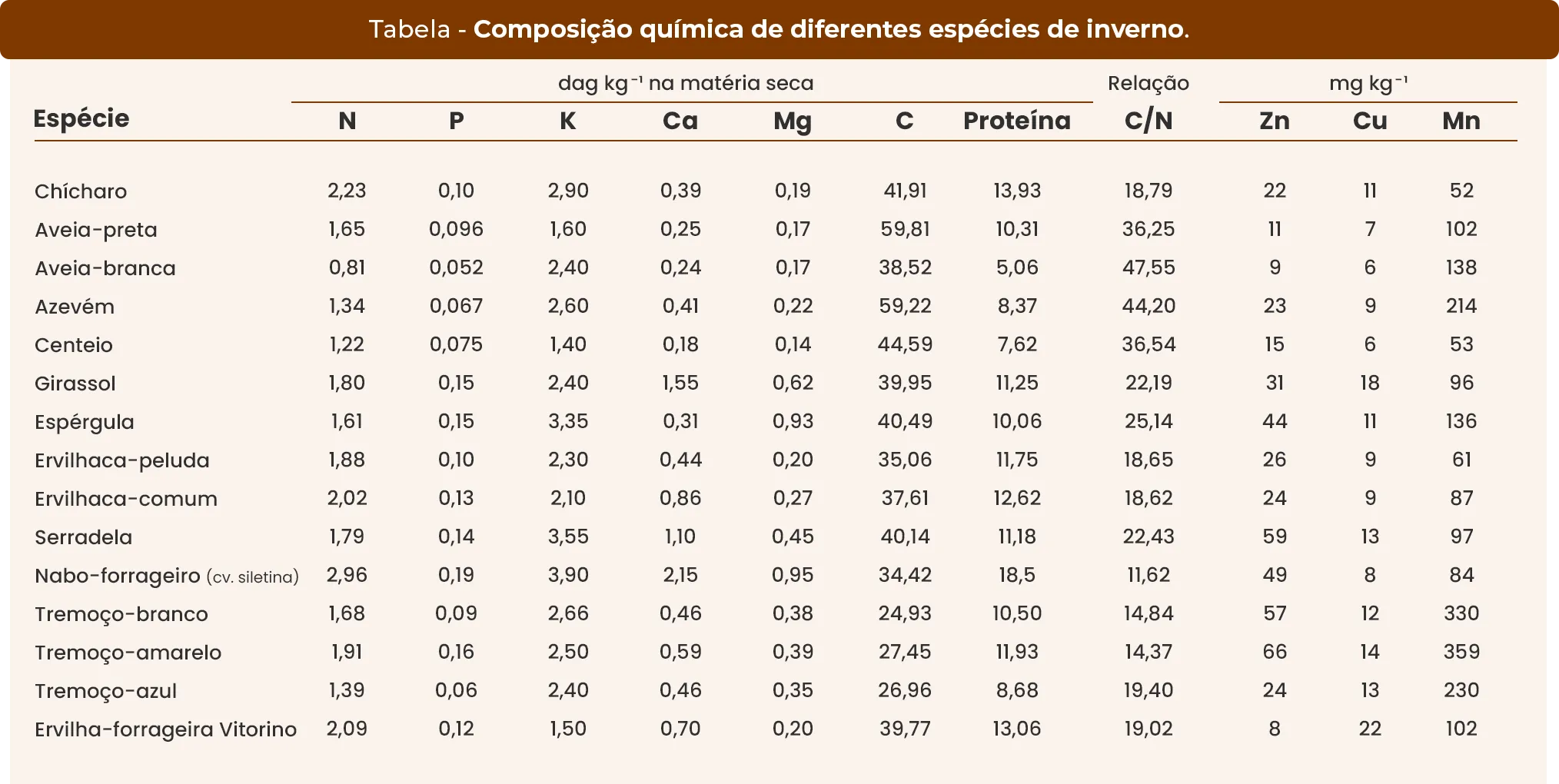 Como exemplo, uma palhada de aveia branca tem uma relação C/N em torno de 47. O nabo forrageiro, por sua vez, em torno de 11. Mas é importante se atentar a alguns detalhes além da relação C/N para a decomposição dos resíduos: tamanho da partícula, quantidade e espécies microbianas, temperatura e umidade, pois todos influenciam diretamente o processo. A mesma planta pode ter um tempo de decomposição diferente se cultivada no Norte, com clima quente e seco, ou no Sul, com clima frio e úmido.